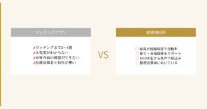 本気度がわからない。 アプリには「なんとなく登録している人」が一定数います。何度かやり取りして会って、初めて「結婚は考えていない」とわかる——その繰り返しは、限られた時間の中では大きなロスです。